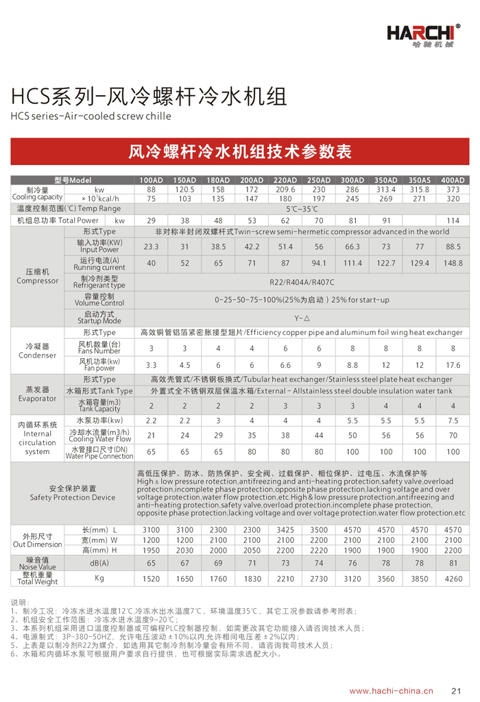 產(chǎn)品特點(diǎn)Features: 1、采用國(guó)際最先進(jìn)的半封閉螺桿壓縮機(jī),電機(jī)、壓縮機(jī)一體化,無(wú)軸封滲漏之慮;電器及制冷系統(tǒng)原器件全部為世界著名品牌; 2、壓縮機(jī)容量控制采用多段式或無(wú)段式,提供更大范圍的制冷量,載何性能好,穩(wěn)定性和可靠性更高,更加節(jié)省能源,壓縮機(jī)采用卸載降壓?jiǎn)?dòng),避免對(duì)電網(wǎng)的沖擊; 3、機(jī)組可根據(jù)負(fù)荷的需求,實(shí)行智能化程序控制:100%、75%、50%、25%(或啟動(dòng))、0,通過(guò)四段空調(diào)式連續(xù)卸載容量控制系統(tǒng),更節(jié)省能耗; 4、采用德國(guó)“SIEMENS”PLC可編程觸摸控制器,人機(jī)界面全中文顯示,動(dòng)畫顯示機(jī)組系統(tǒng)各部運(yùn)轉(zhuǎn)狀態(tài),可進(jìn)行參數(shù)設(shè)定、能量模擬控制、故障查詢等多重保護(hù)功能,保證機(jī)組安全穩(wěn)定運(yùn)行; 5、風(fēng)冷冷凝器全部采用進(jìn)口風(fēng)機(jī)及大風(fēng)量低噪音軸流設(shè)計(jì),換熱效率更高;風(fēng)冷系統(tǒng)無(wú)需配置冷卻水塔及冷卻水泵,安裝簡(jiǎn)單,移動(dòng)方便,適合生產(chǎn)場(chǎng)地比較緊缺的環(huán)境使用; 6、水冷系列需要配置冷卻水塔及冷卻水泵,冷水機(jī)放置在室內(nèi),噪音比較低,制冷效果更好,應(yīng)用于通風(fēng)散熱不是很好的環(huán)境; 7、為保證使用安全,機(jī)組內(nèi)置漏電保護(hù)器、相位保護(hù)、過(guò)載保護(hù)、電流保護(hù);系統(tǒng)安裝了高、低壓保護(hù)傳感器,為防止缺水或循環(huán)水系統(tǒng)內(nèi)部結(jié)冰,機(jī)組安裝了流量開(kāi)關(guān)和低液位保護(hù)裝置。 8、螺桿冷水機(jī)組使用壽命長(zhǎng),穩(wěn)定性好,無(wú)故障運(yùn)行可達(dá)4萬(wàn)小時(shí)以上。